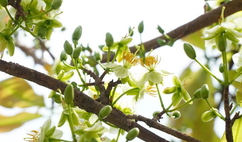 Hoa trắng sữa, viền vàng nhạt, nhụy vàng rực; đa phần 5 cánh, cá thể lai có thể 9 cánh. Búp thành chùm 5–20 nụ, thời gian từ nứt nụ đến nở ~10 ngày; bông bền 3–4 ngày.