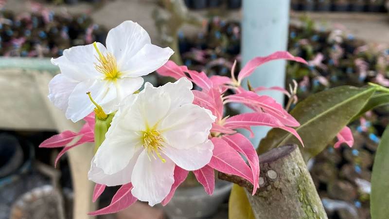 Giống dễ trồng – thọ dài, đọt non hồng đỏ chuyển dần xanh nhạt pha trắng rất bắt mắt. Hoa trắng tinh, nhụy vàng, chùm 3–5 bông, khoảng 12 cánh.